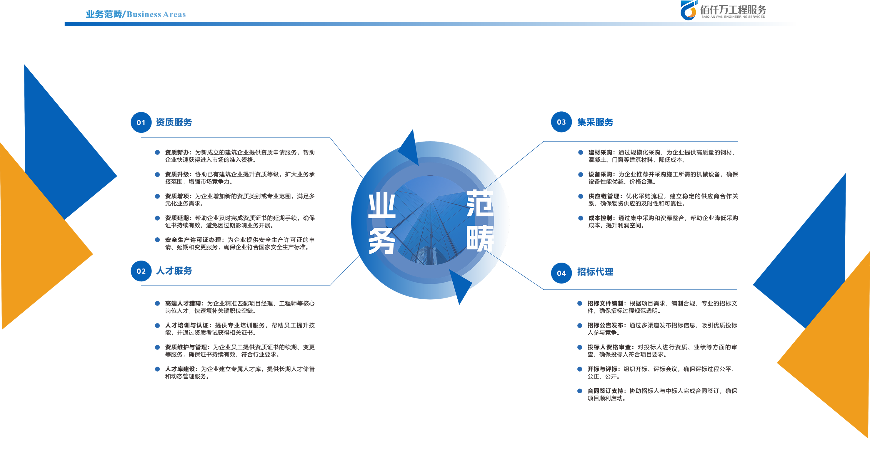 广东佰仟万建筑咨询有限公司,锚定打造多元化业务服务品牌的目标,矢志不渝。公司核心业务是构建建筑行业一站式服务平台,通盖建筑资质综合业务(新办、升级增项,延期等)、安全生产许可证办理、人才猎聘、资质维护等板块,服务网络全面覆盖广东省,并且全力为企业客户塑造全生命周期的闭环服务生态。